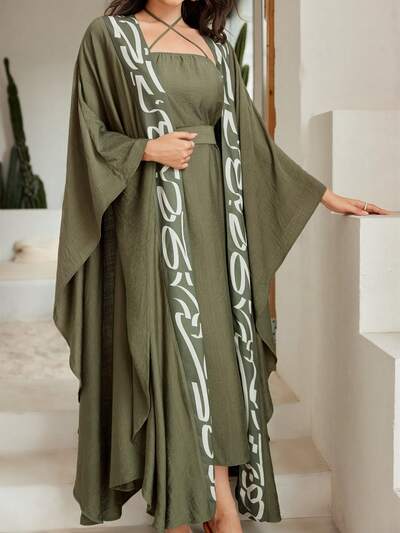 Solid Color Waist Cinched Casual Dress With Patchwork Print Front Open Jacket 2 Pieces Set-32%