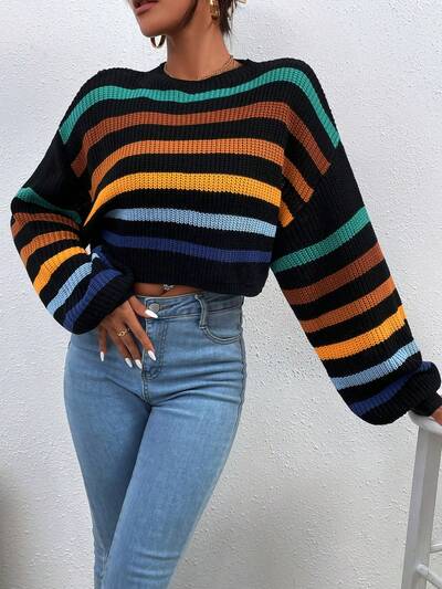 Striped Pattern Drop Shoulder Knit Pullover Fall Winter Sweater-50%