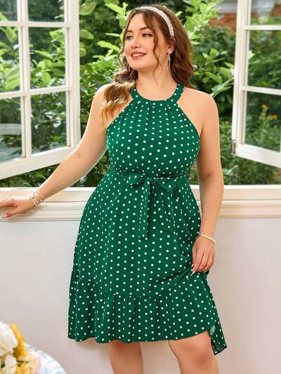 Summer Green Polka Dot Halterneck Vacation Dress With Ruffle Trim, Plus Size-27%