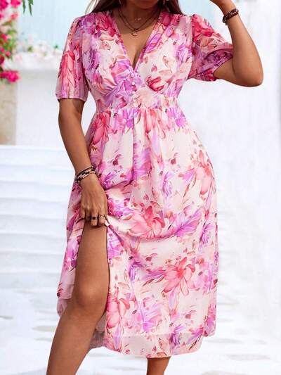 Plus Size Women's Floral Printed V-Neck Short Puff Sleeve Dress-30%