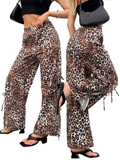 2024 New Arrival Leopard Pattern Straight Leg Casual Pants For Women With Side High Slit And Belt