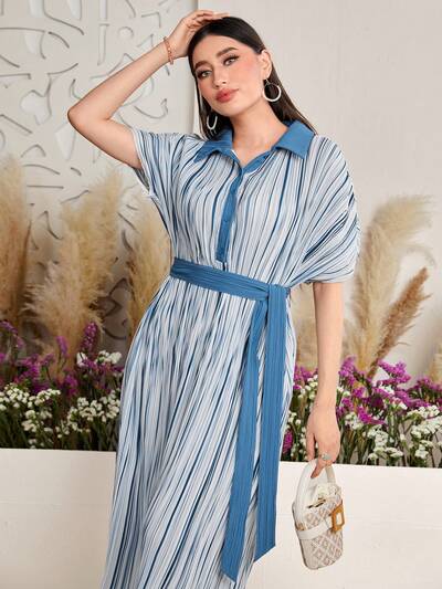 Women's Striped Button Down Half-Placket Batwing Sleeve Dress-22%