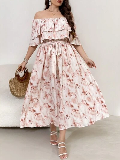 Plus Size Women's Holiday Style Floral Print Ruffle Ruffle Dress