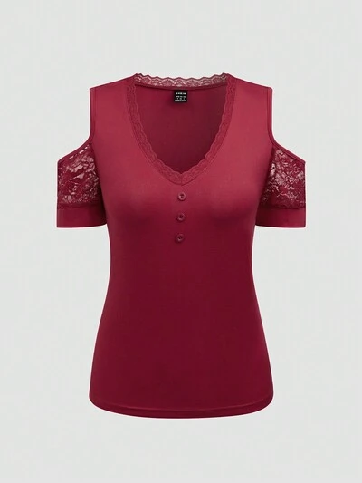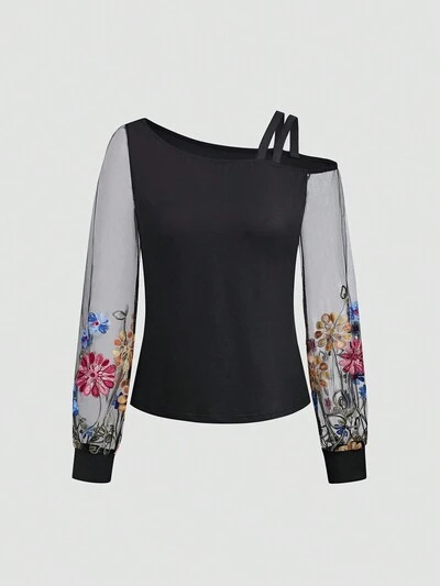 Women's Knitted Off Shoulder Mesh Contrast Embroidered T-Shirt