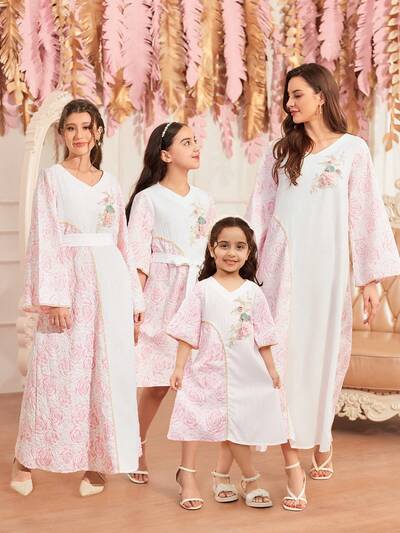 Tween Girl Pink Floral Textured Fabric Splice Dress With Belt, Mommy And Me Matching Outfits (4 Pieces Sold Separately)-47%