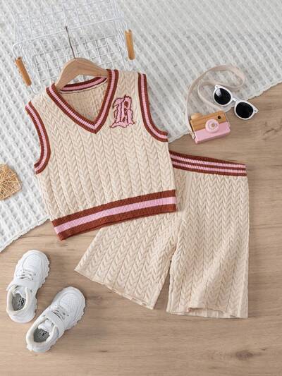 Tween Girl Letter Pattern Striped Trim Crop Tank Top & Shorts-60%