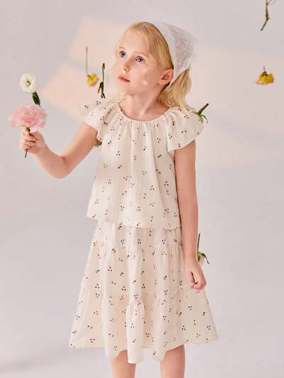 Young Girls' Summer Fresh And Sweet Cherry Printed Casual Outfit-47%