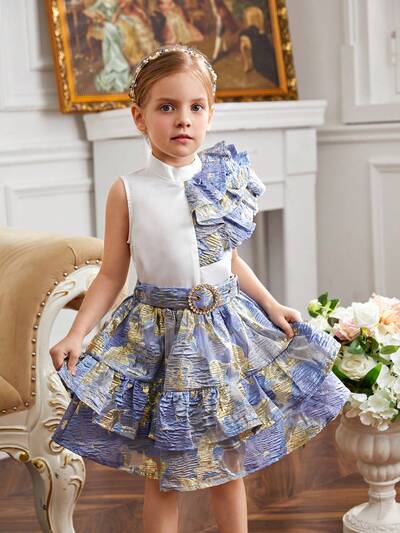 Young Girl Stand Collar Layered Ruffle Sleeveless Blouse Jacquard A-Line Skirt Two Pieces Outfit-47%