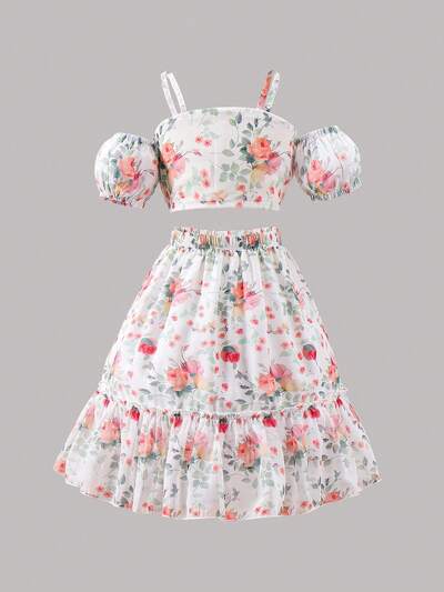 Young Girl Fashionable And Elegant Floral Print Sweet Vacation Off-The-Shoulder Top With Ruffled Hem Skirt Two-Piece Set-47%