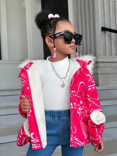 Young Girl Paisley Print Fuzzy Trim Hooded Padded Coat With 1pair Gloves-60%