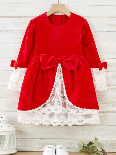 Young Girl Cartoon Graphic Bow Front Flounce Sleeve Ruffle Hem Dress for Christmas-60%