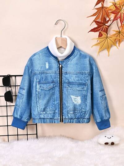 Young Girl 1pc Ripped Flap Pocket Drop Shoulder Bomber Jacket-60%