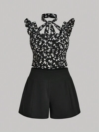 Plus Size Women Summer Floral Print Halterneck Tie Front Flutter Sleeve Top And Shorts Set
