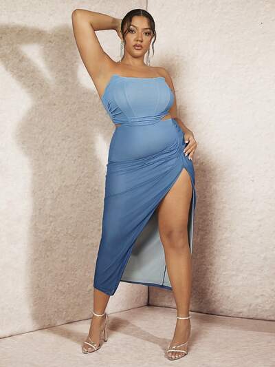 Plus Size Women's Gradient Print Ruffle Short Bustier Top And Gradient Print Drawstring Split Thigh Skirt Set