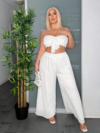 Strapless Tie-Front Top And High Waist Loose Straight Pants Plus Size Two Pieces Set-39%