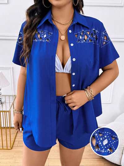 Summer Plus Size Casual Rhinestone Hollow Out Short Sleeve Shirt And Shorts Set-60%