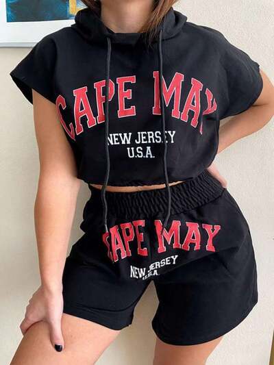 Plus Size Women'S Letter Printed Short Sleeve Hooded T-Shirt And Shorts Set-30%