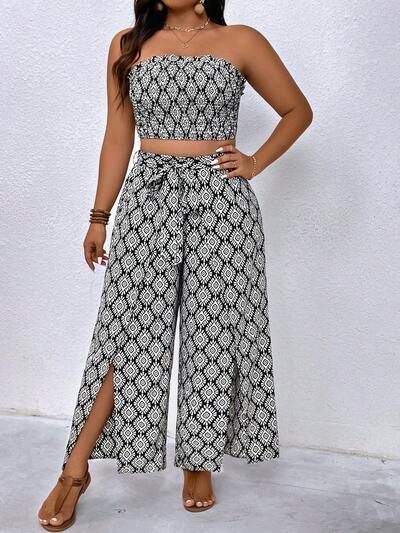 Plus Size Women's Fashion Printed Bandeau Top With High Slit Wide Leg Pants Set