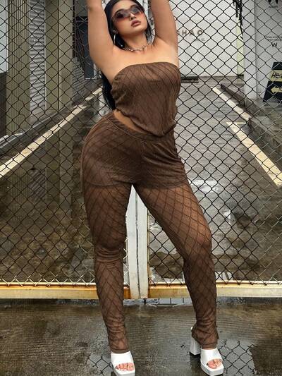 Plus Size Summer Holiday Solid Color Texture Strapless Top And Long Pants Slim Fit 2-Piece Set-60%