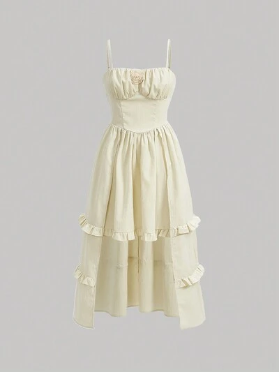 Women's Solid Color 3d Flower Design Ruffle Hem Spaghetti Strap Dress-60%