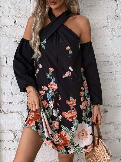 Floral Open Shoulder Halterneck Dress Fall Cloth For Women-23%