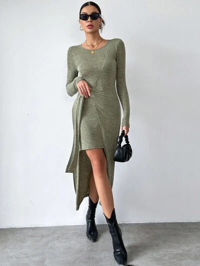 Women's Solid Color Button Detail High Front Slit Belted Dress-65%