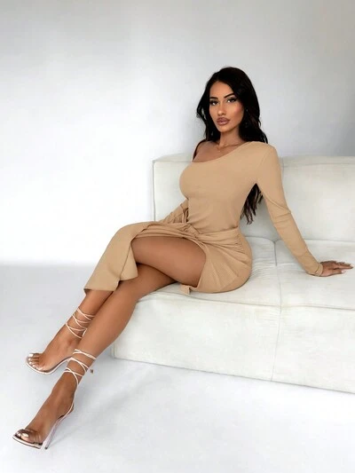 Asymetric Hem Long Sleeve Slim Fit Casual Dress Winter Elegant Brown Evening Dress-65%