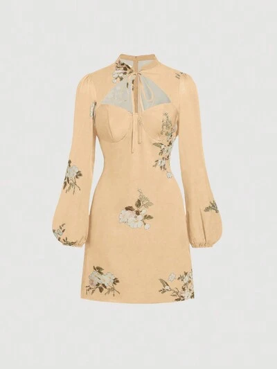Women's Apricot-colored Floral Printed Waist-tied Dress-60%