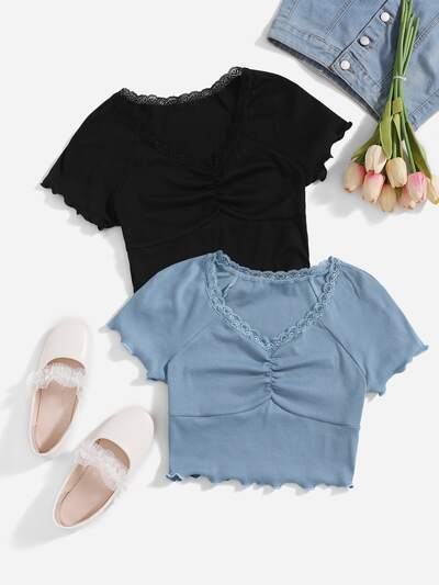 Teen Girls 2pcs Lace Trim Ruched Front Tee-60%