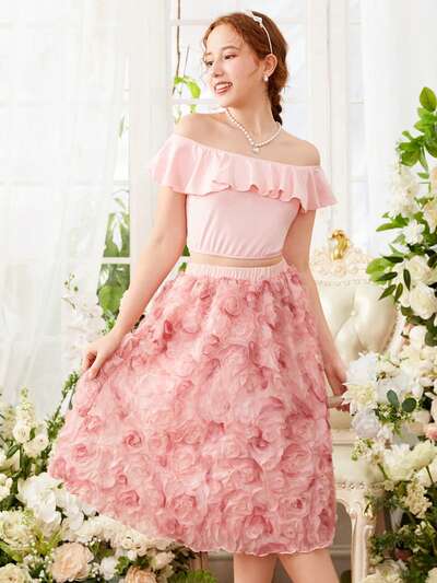 Teen Girl Solid Color Off Shoulder Ruffle Trim Top & 3d Flower Mesh A-Line Skirt Two Pieces Set-44%