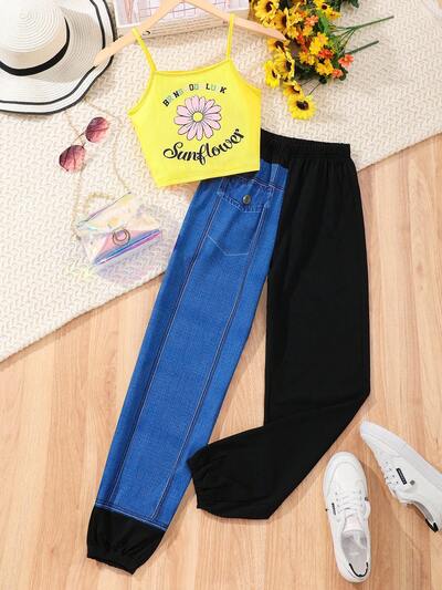 Teen Girl Floral & Letter Printed Spaghetti Strap Top And Denim Patchwork Long Pants Set-60%