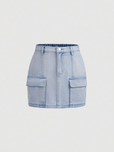 Teen Girl's Casual High Waist Mini A-Line Denim Skirt With Cargo Pocket Detail-60%