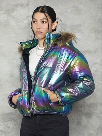 Teen Girl Holographic Fuzzy Trim Hooded Padded Coat,In Fall/Winter-60%