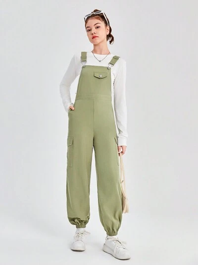 Teenagers' Casual Woven Net Solid Color Pocket Jumpsuit With Adjustable Drawstring Hem And Shoulder Straps-60%