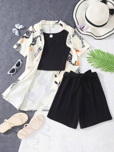 Teen Girls Crop Tank Top & Shorts & Animal Print Blouse-60%