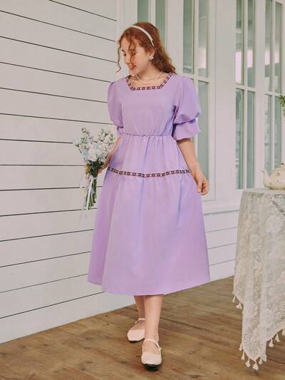 Teen Girls' Woven Solid Color Dress With Pleated Bust, V-Shaped Waistline And Puff Sleeves