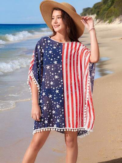 Teen Girl Star And Stripes Flag Design Graphic Print Fringed Beach Cover-Up, Perfect For Independence Day And Summer Vacation, Can Be Matched With Swimwear Or Chiffon Tops