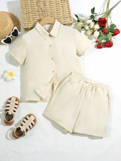 Solid Color Short Sleeve Shirt And Shorts Set For Tween Girls-60%