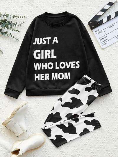 Tween Girl Slogan Graphic Pullover & Cow Print Leggings-46%