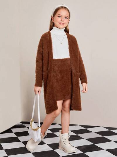 2pcs/set Teen Girls' Elegant Loose Fit Long Sleeve Cardigan And Skirt-65%