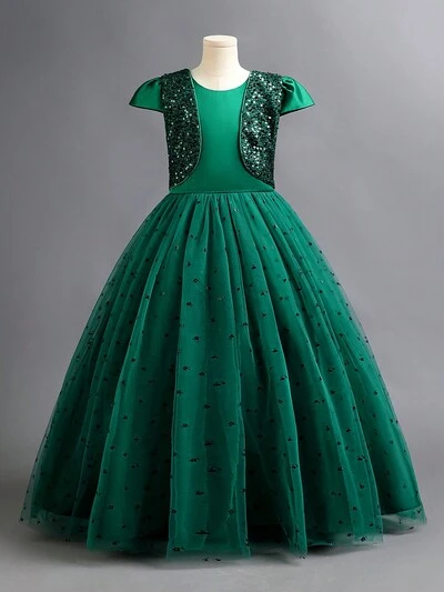 Tween Girl Sequin Panel Mesh Overlay Gown Dress-60%
