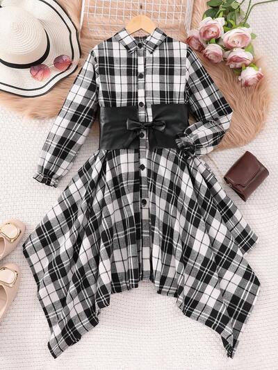 Tween Girl Plaid Print Asymmetrical Hem Shirt Dress-60%