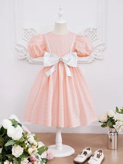 Girls Puff Sleeve Floral Applique Detail Bow Back Dress