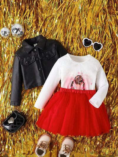 Baby Girls' Simple All-match Casual Jacket & Character Letter Print T-shirt & Mesh Skirt Cute Set-60%