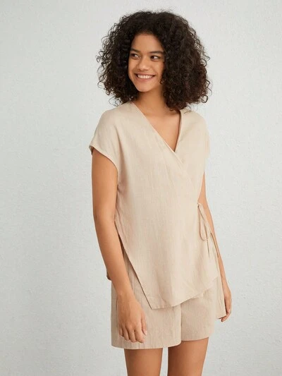 Leisure V-Neck Wrap Front Top With Tie And Side Slit, Home Clothes-59%