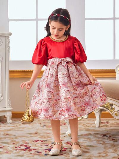 Girl'S Plant-Printed Puff-Sleeved Dress With Bow Decoration-47%