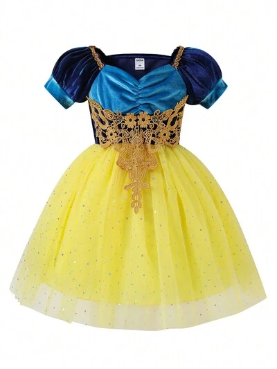 Young Girl Puff Sleeve Sequin Decor Ruched Front Mesh Hem Party Dress-60%