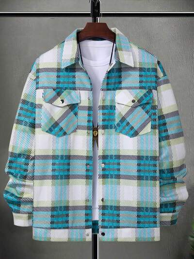 Men's Loose Fit Plaid Printed Coat With Flap Pockets, Tee Not Included-60%