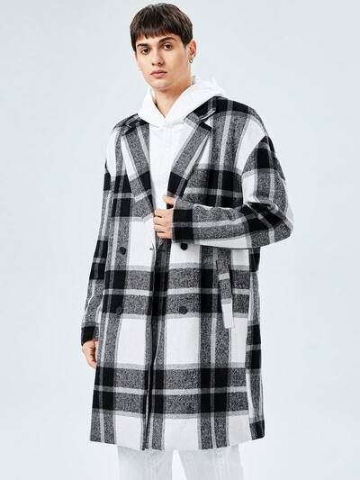 Loose Fit Plaid Double-Breasted Drop Shoulder Lapel Neck Coat Without Sweater For Men, For Fall Winter-65%