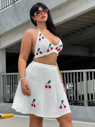 Plus-Size Women's Fashionable Cherry Pattern Knitted Suit-26%
